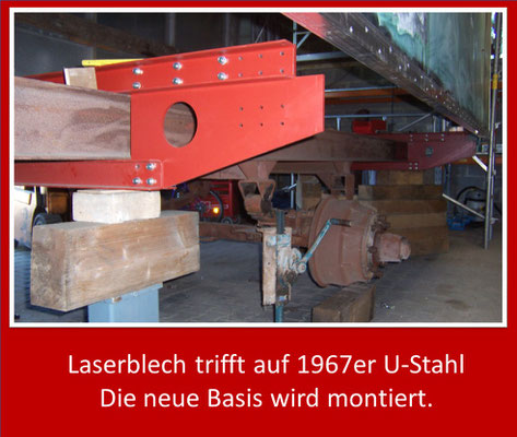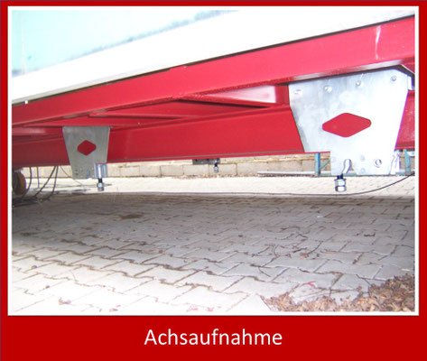 Nach Überholung der Achseinheit wurden an den Hilfsrahmen Befestigungslaschen für die Fixierung am Auflieger Rahmen angeschweißt.