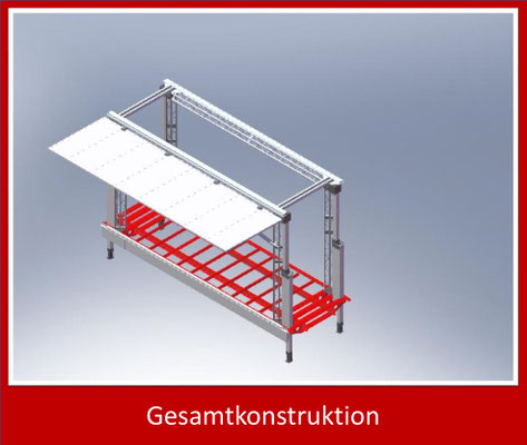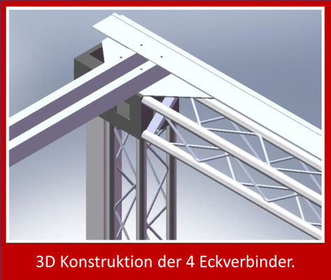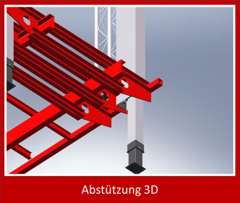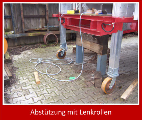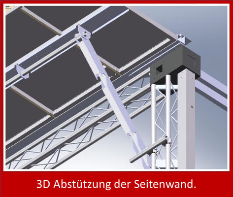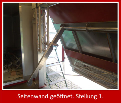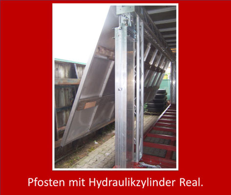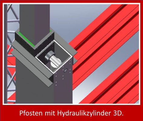 Für die Abstützung des Aufliegers und das Anheben des Daches wurden 4 Stütz Pfosten konstruiert. Jeder Pfosten hat einen hydraulischen Ausschub nach oben und nach unten.