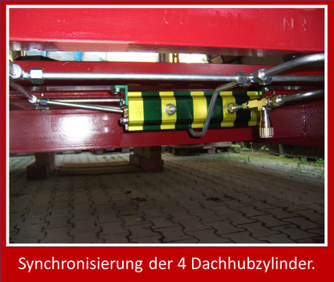Die Anhebung des Daches erfolgt durch die vier Hub Zylinder die über einen Zahnrad Mengenteiler synchron 1500mm ein und ausfahren.