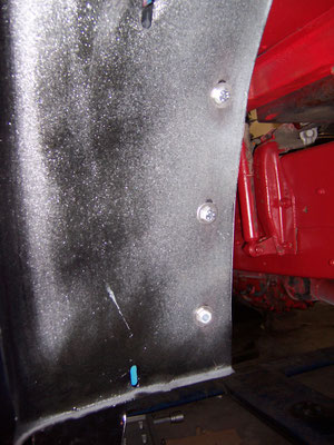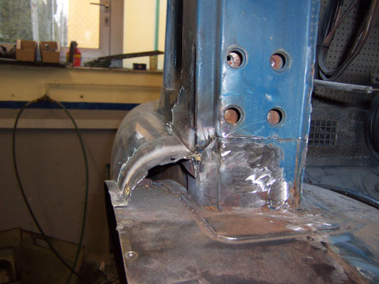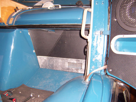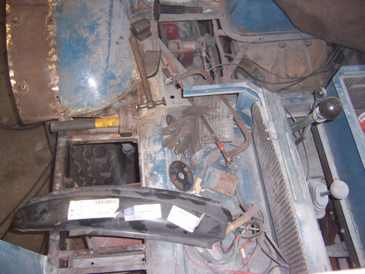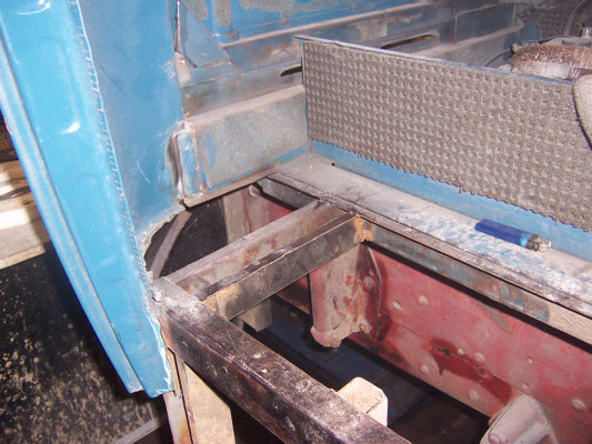 Obwohl der Vorbesitzer schon einmal die Kabine bei einer Fachwerkstatt restaurieren ließ, mußten die seitlichen Türbereiche und die komplette Unterkonstruktion der Stufen neu aufgebaut werden. Ferner mußte die Dachhaut neu eingeklebt werden. Leider hatten die Akteure von damals keinerlei Konservierungsmaßnahmen durchgeführt und auch die Reste des Strahlmittel nicht entfernt!